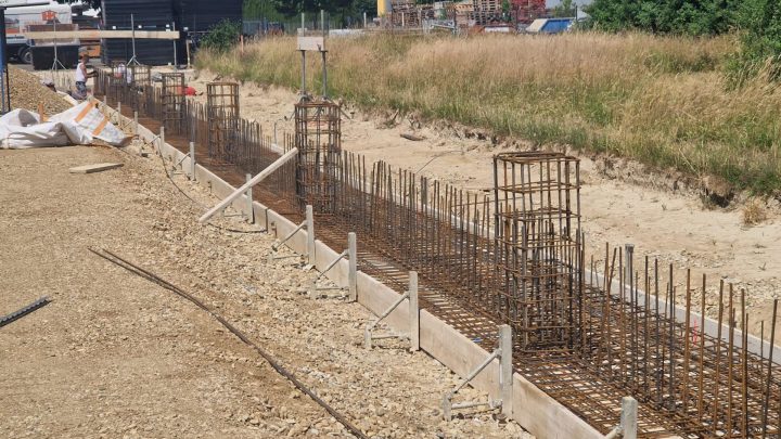 Weiterentwicklung der gewerblichen Lagerhalle mit Büros: Bewehrung der Streifen- und Stützenfundamente Betonieren der Streifenfundamente Versetzen der Fertigteil-Frostschürzen Fertigstellung der Frostschürzen und Tür-/Torschwellen