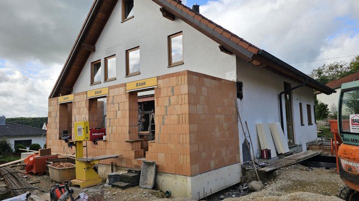 Fortschritte beim Anbau bei Ehingen: Bewehrung Bodenplatte Anbau 1 Herstellen eines Natursteinmauerwerkes Fundament für Anbau 2 Bewehrung Bodenplatte von Anbau 2 Einschalen und bewehren der Kelleraußenwände Betonieren Kelleraußenwände von Anbau 1
