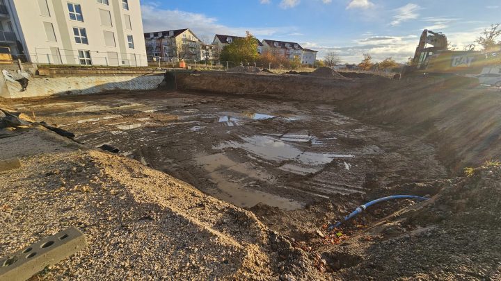 Startschuß beim Wohnblock in Riedlingen: Oberboden abtragen Baugrubenaushub Aushub Fundamente Bewehrung der Einzelfundamente