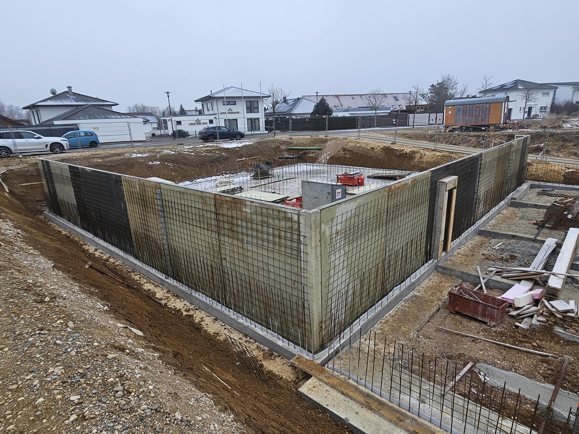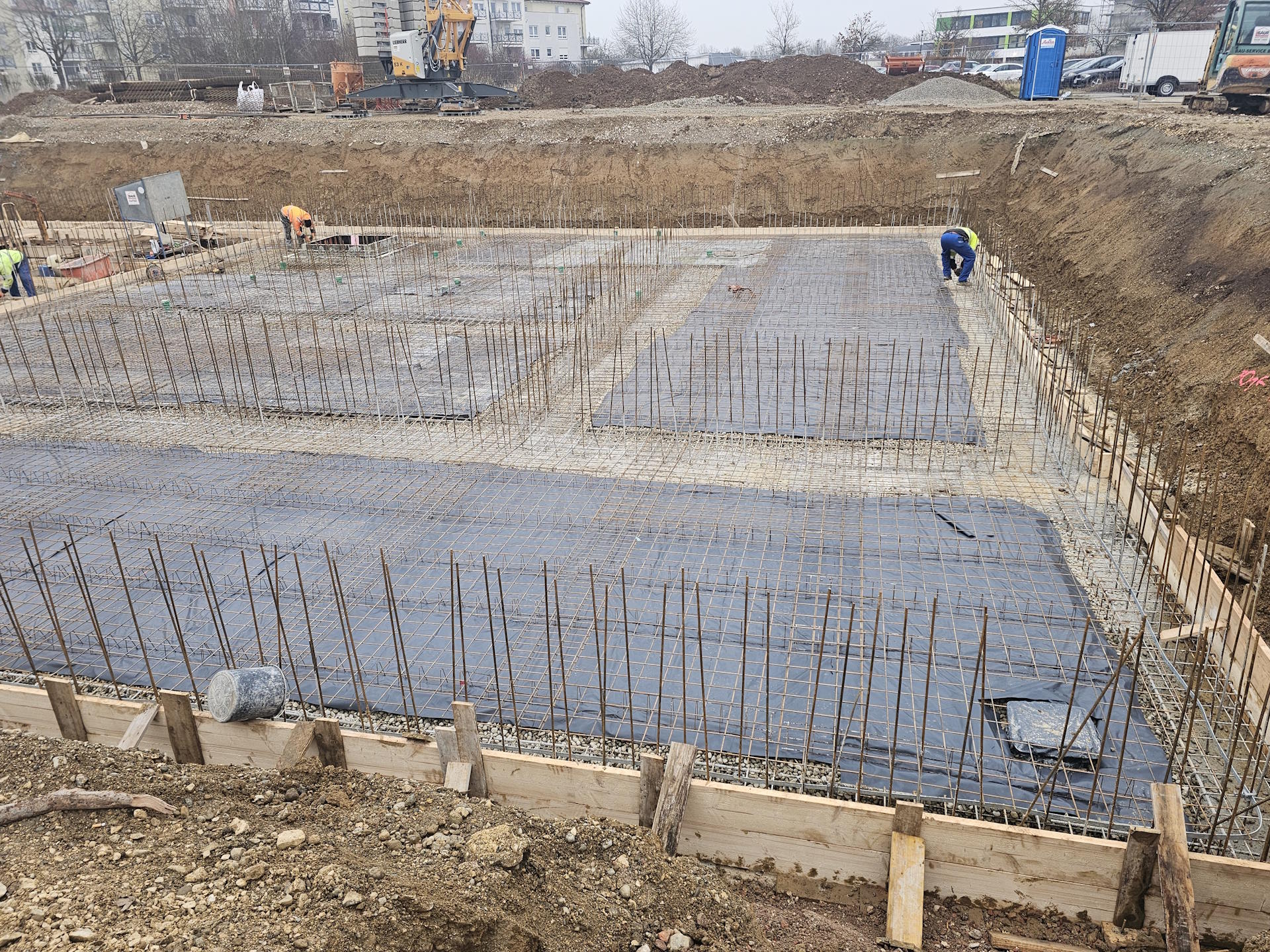 Fortschritt beim MFH in Riedlingen: Herstellen von Bewehrungskörben, bewehren von Fundamenten Betonieren von Fundamenten Entwässerungsleitungen verlegen Unterbau der Bodenplatte herstellten und BoPla bewehren Betonieren der …