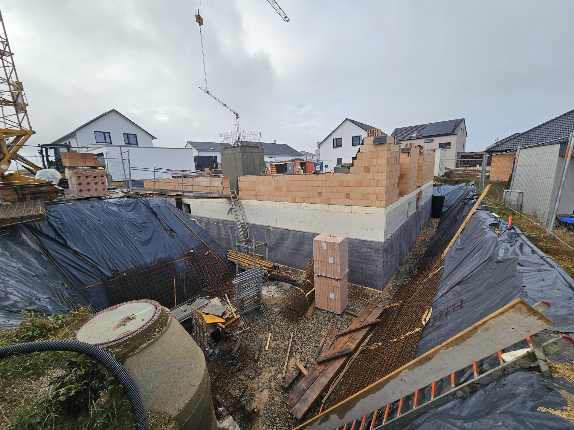 Weiterentwicklung beim 9-Familienhaus in Ehingen: Verlegung der Leerrohre für Elektriker Anlegen der 1. Mauerschicht im EG Mauern der Außenwände im EG Verfüllen der Arbeitsräume Betonieren …